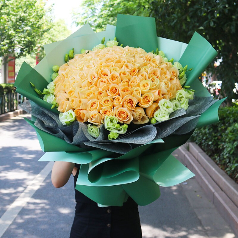 花 材:99朵精品香槟玫瑰,外围桔梗花环绕。