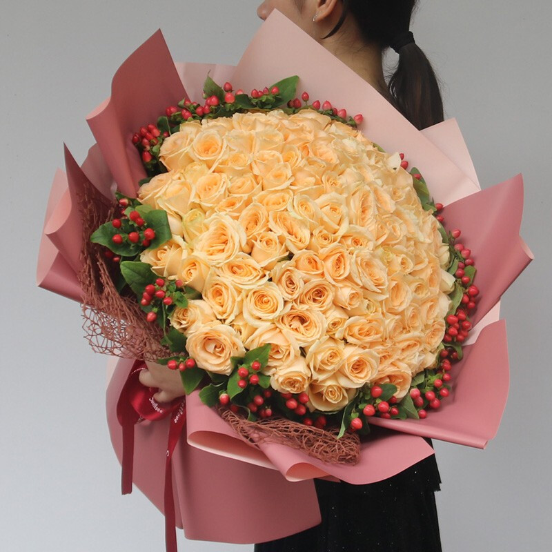 花材: 99朵精品香槟玫瑰,外围红豆环绕。