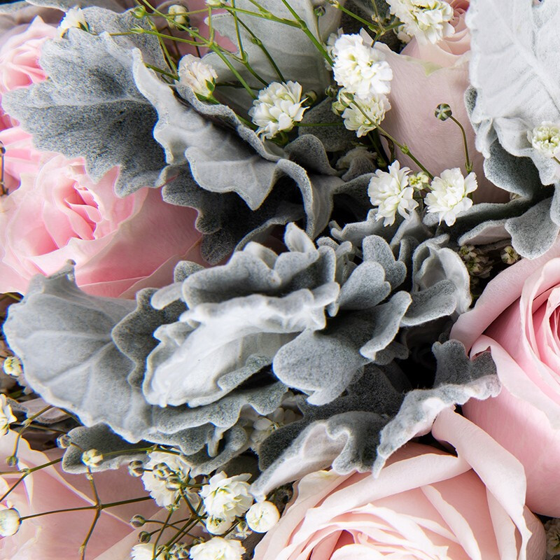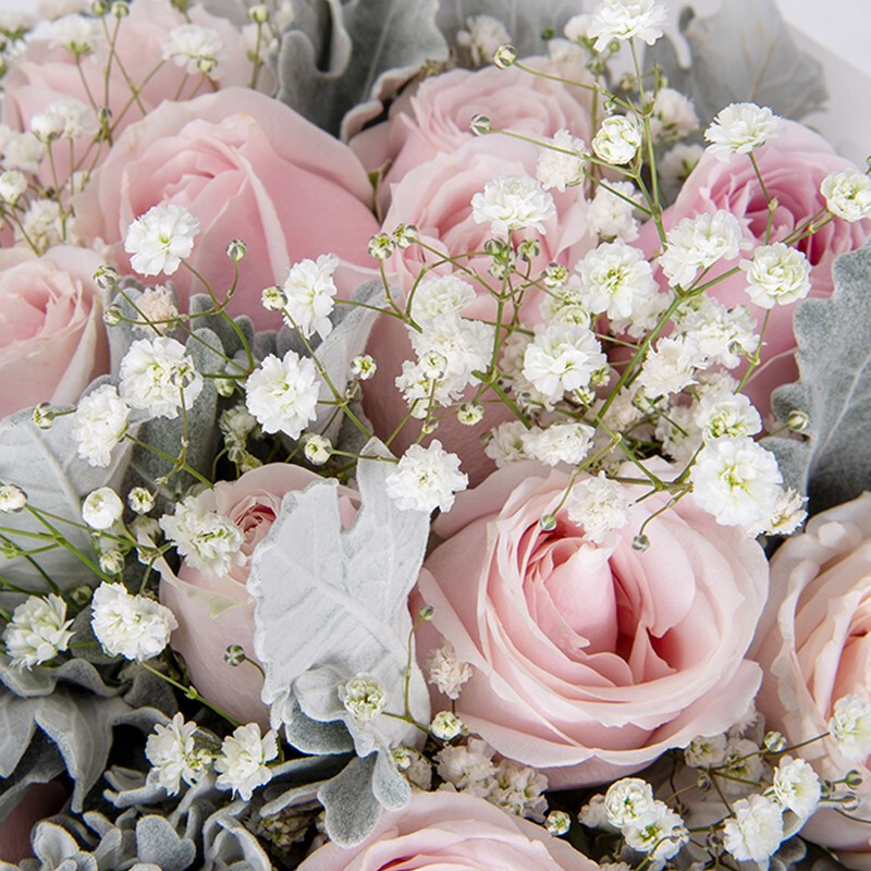 花材: 19支精品粉玫瑰,搭配银叶菊,粉色、白色满天星丰满间插。