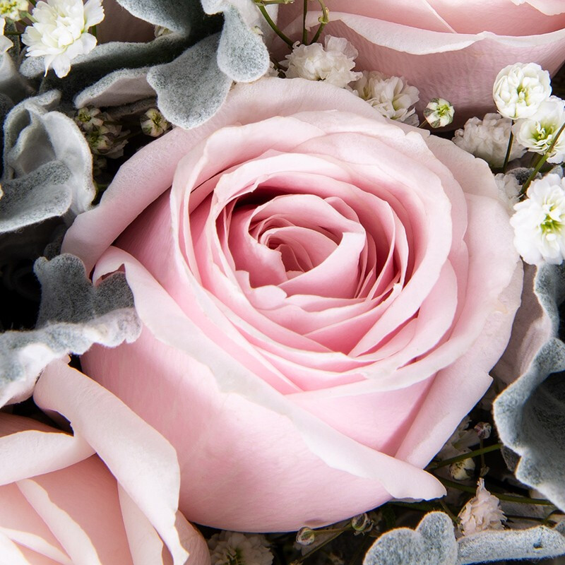 花 材:19支精品粉玫瑰,搭配银叶菊,粉色、白色满天星丰满间插。