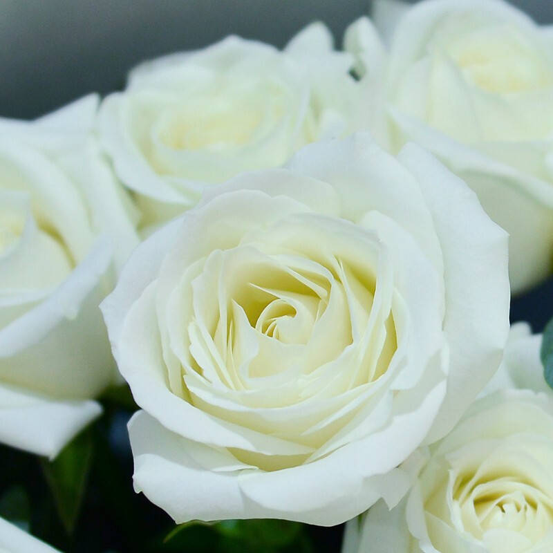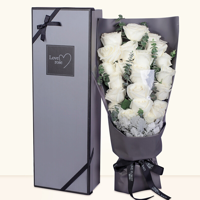 花 材:19朵精品白玫瑰,搭配尤加利叶、银叶菊装饰。