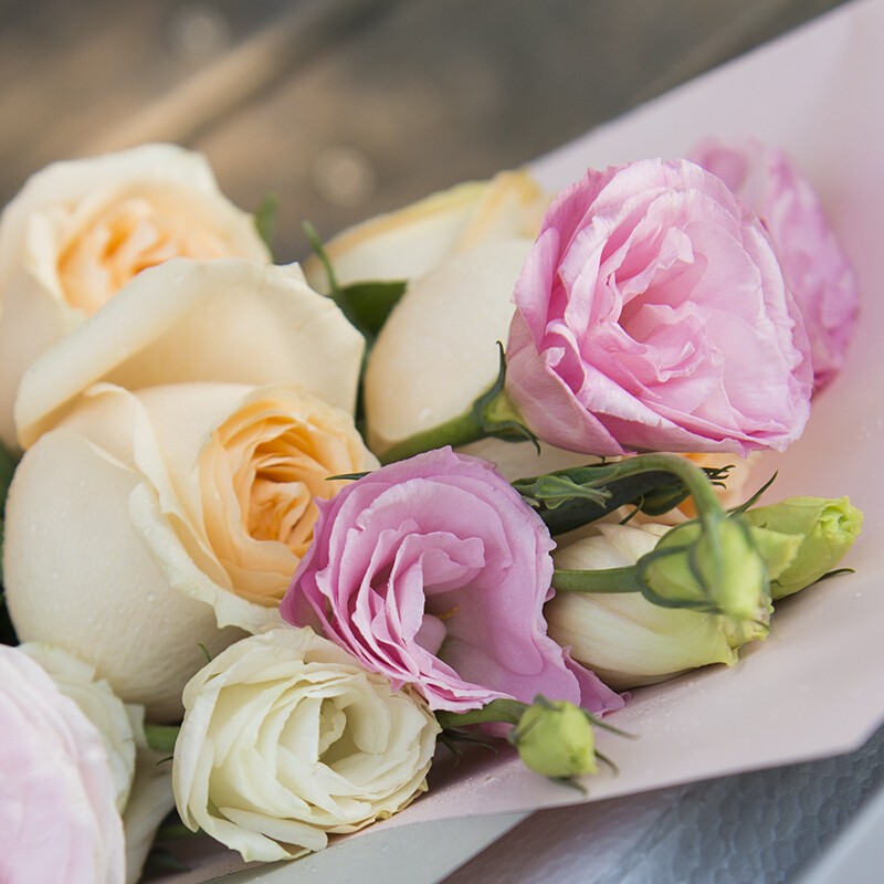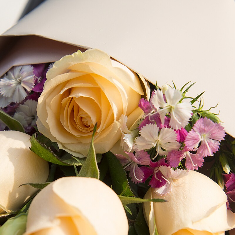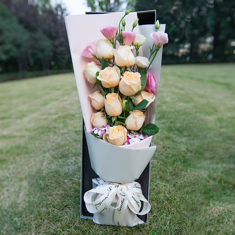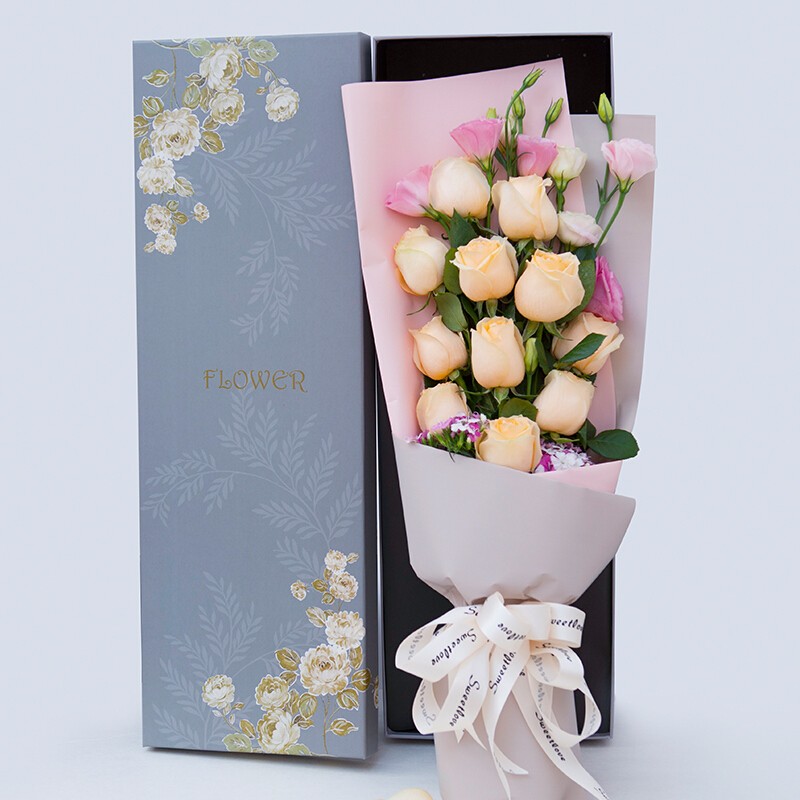 花 材:11朵香槟玫瑰,搭配粉色桔梗,绿叶装饰。