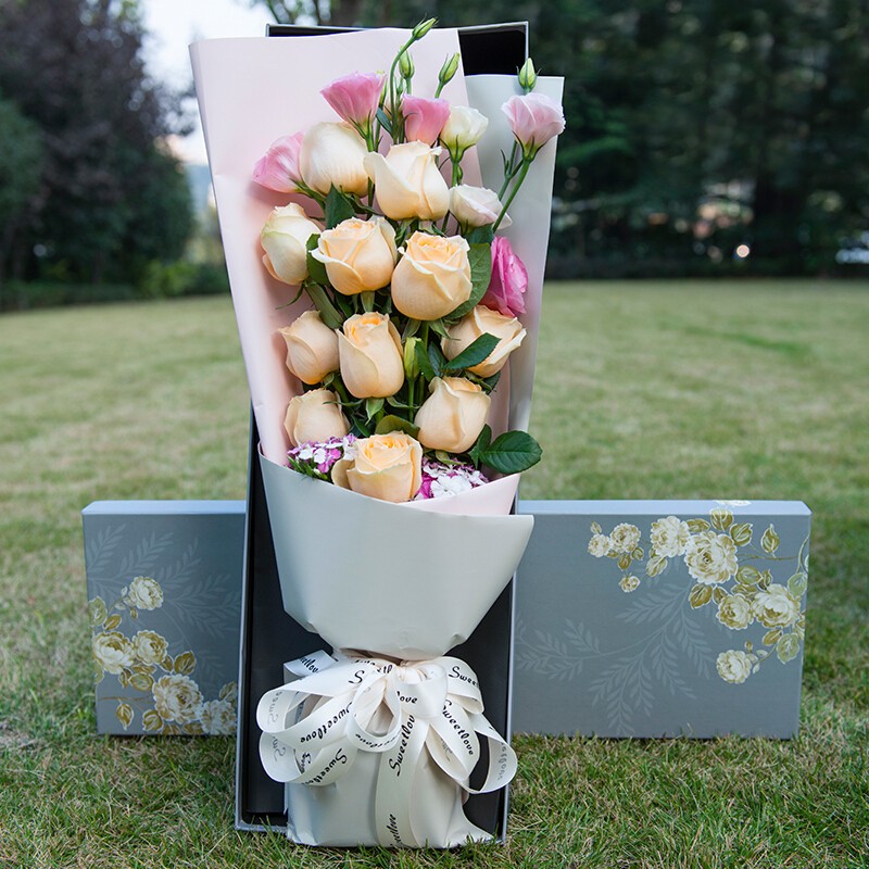 花材: 11朵香槟玫瑰,搭配粉色桔梗,绿叶装饰。