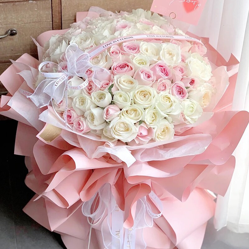 花材: 精选99朵白色、粉色玫瑰(白玫瑰大概占2/3),1只蕾丝蝴蝶结、1条粉白色缎带装饰花面。