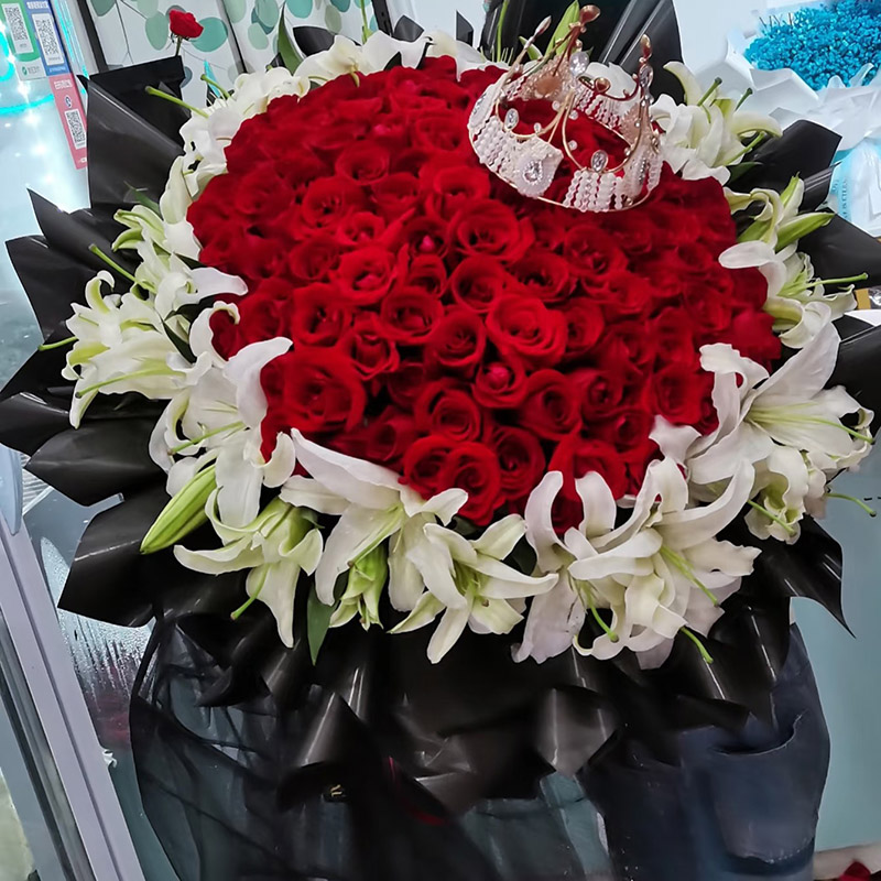 花 材:99朵顶级红玫瑰,33朵白色香水百合外围环绕,皇冠装饰花面。