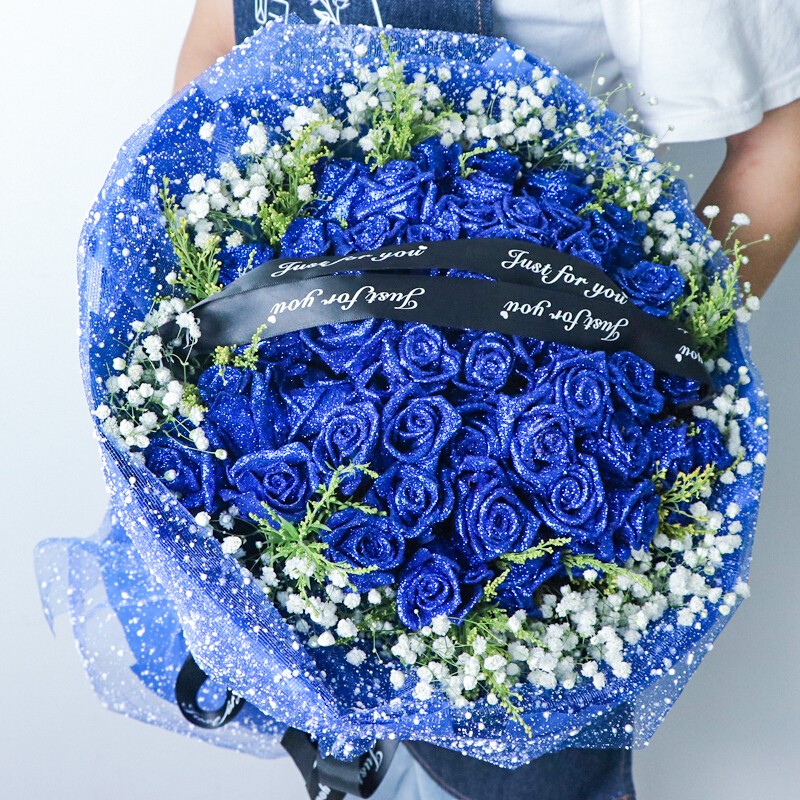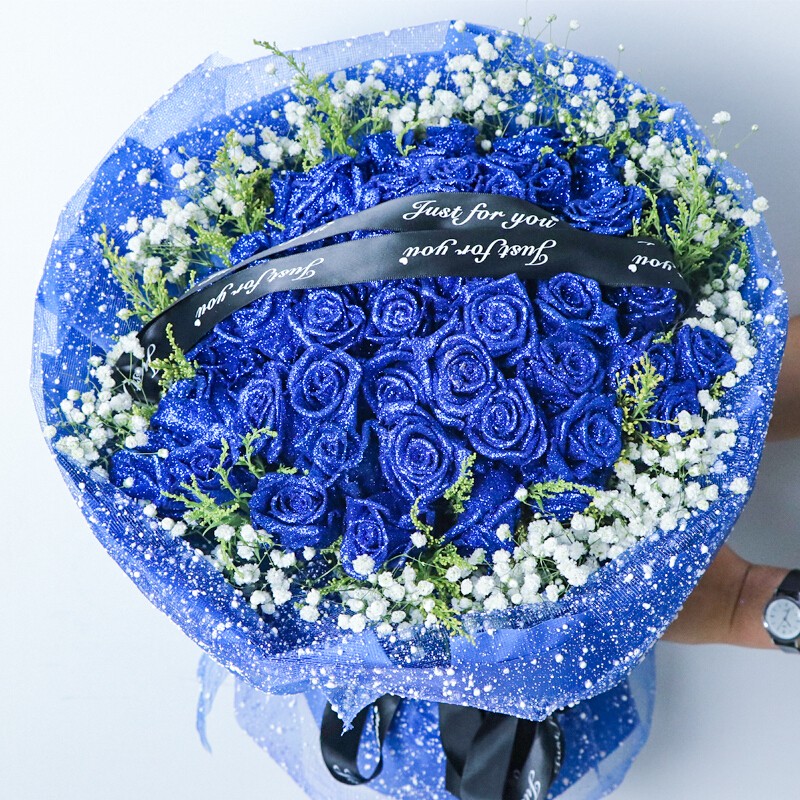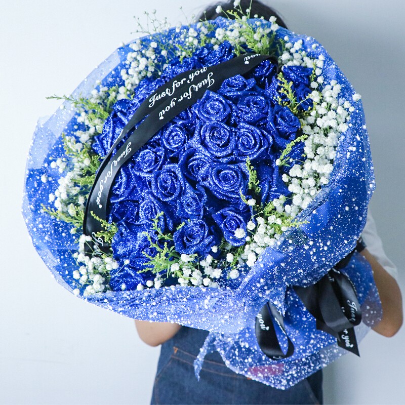花 材:52朵蓝色妖姬,搭配黄莺满天星外围环绕,花面礼品缎带装饰。