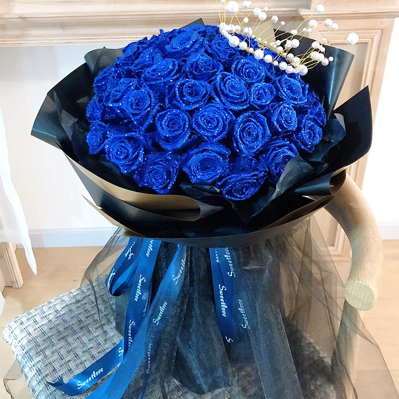 花 材:33朵精品蓝色妖姬,搭配皇冠装饰。