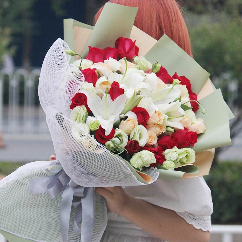 花 材:33朵玫瑰混搭(红玫瑰、香槟玫瑰),2支多头白色香水百合,桔梗装饰。