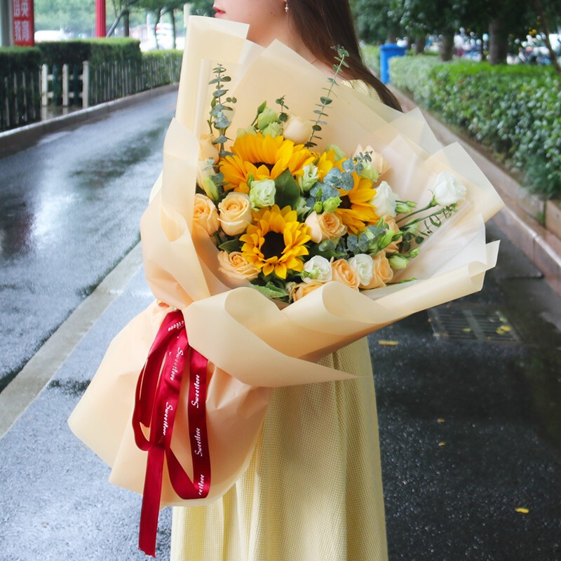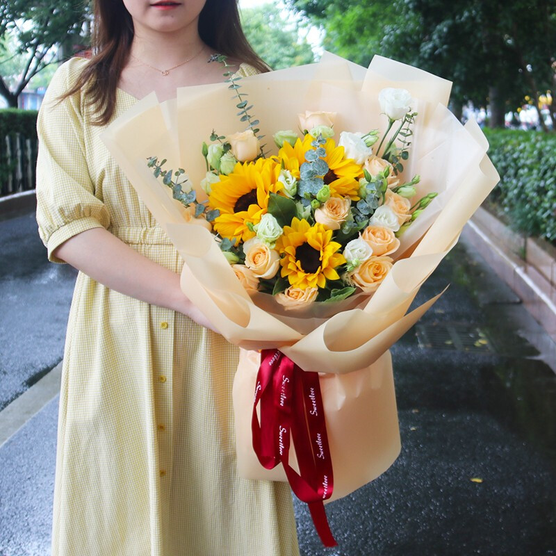花 材:19朵香槟玫瑰、3支向日葵,搭配4支洋桔梗、尤加利叶装饰。