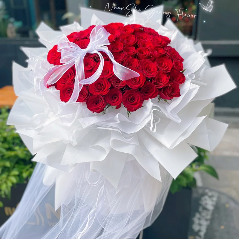 花材: 99朵红玫瑰,白色缎带系蝴蝶结装饰花面。