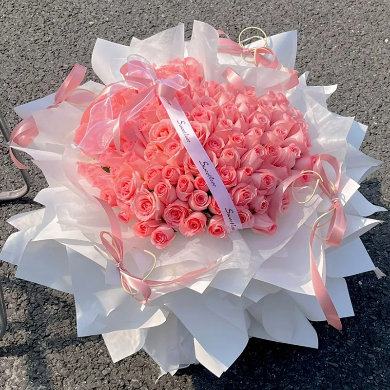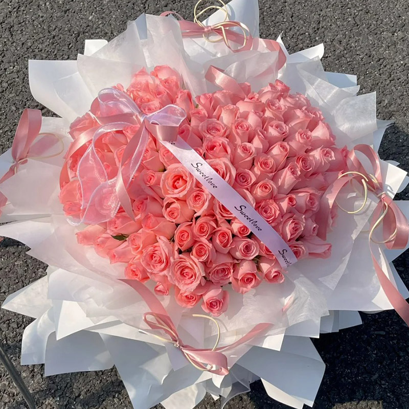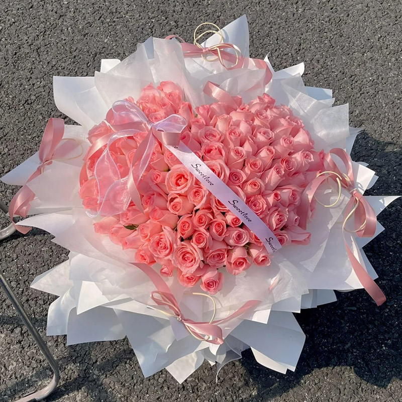 花材: 99朵粉玫瑰,心形造型,搭配1个蝴蝶结缎带装饰花面。