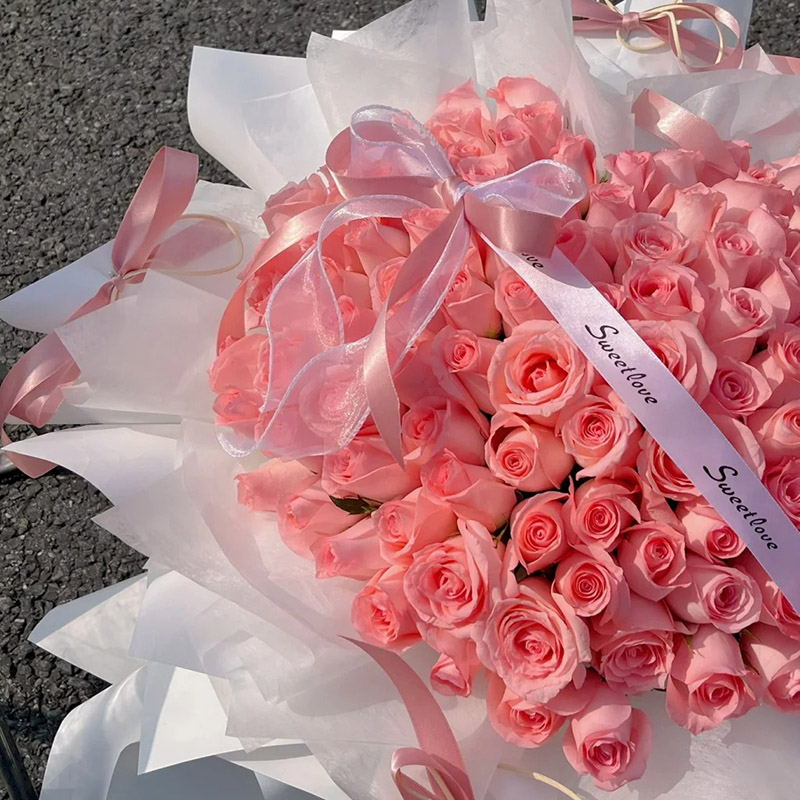 花 材:99朵粉玫瑰,心形造型,搭配1个蝴蝶结缎带装饰花面。
