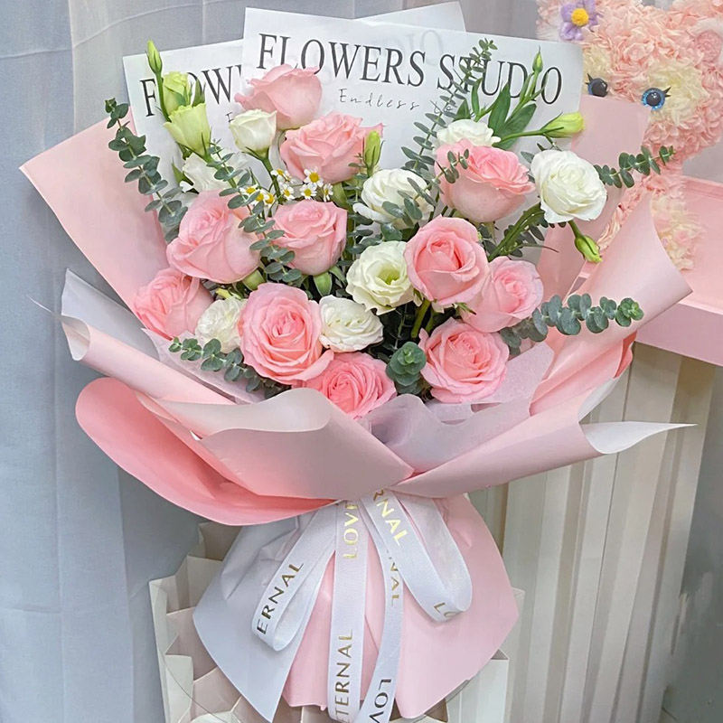 花 材:11朵粉玫瑰,4支洋桔梗(断货则用同数量白玫瑰代替),搭配尤加利叶,洋甘菊装饰。