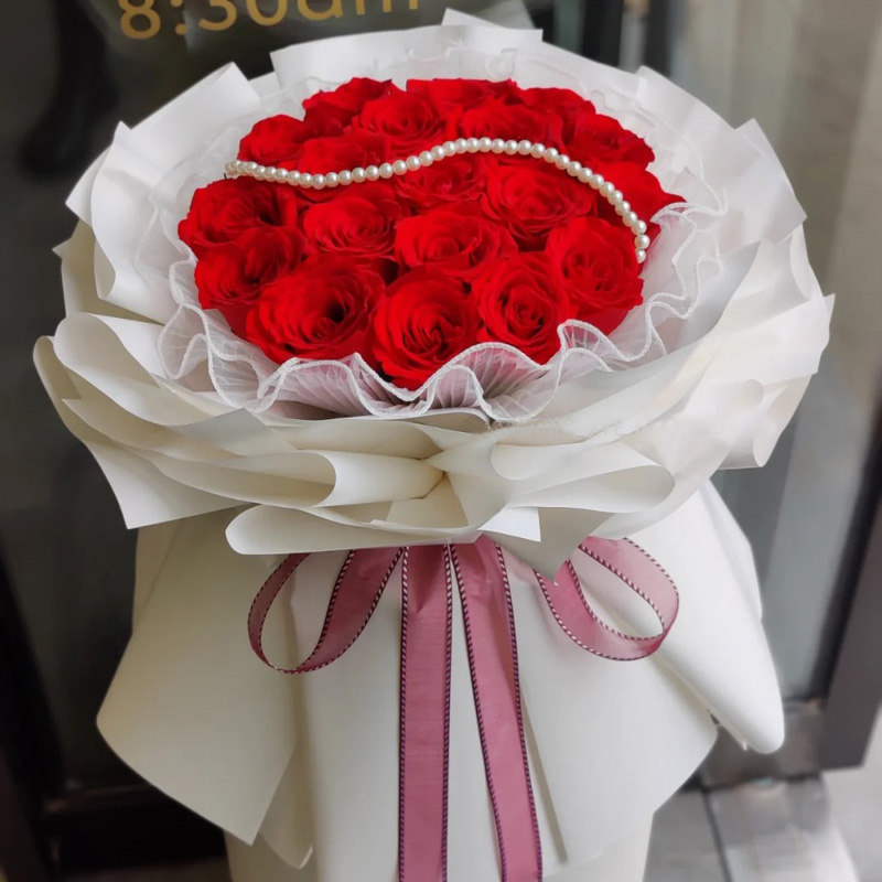 花 材:19朵红玫瑰,1条珠串装饰花面。
