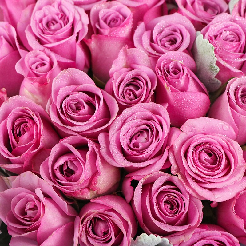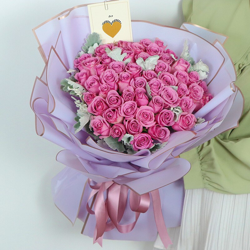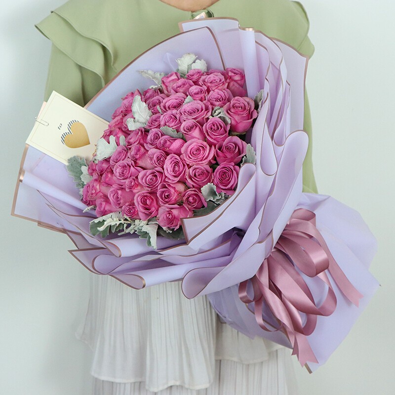 花 材:精选52朵紫玫瑰,搭配银叶菊装饰。
