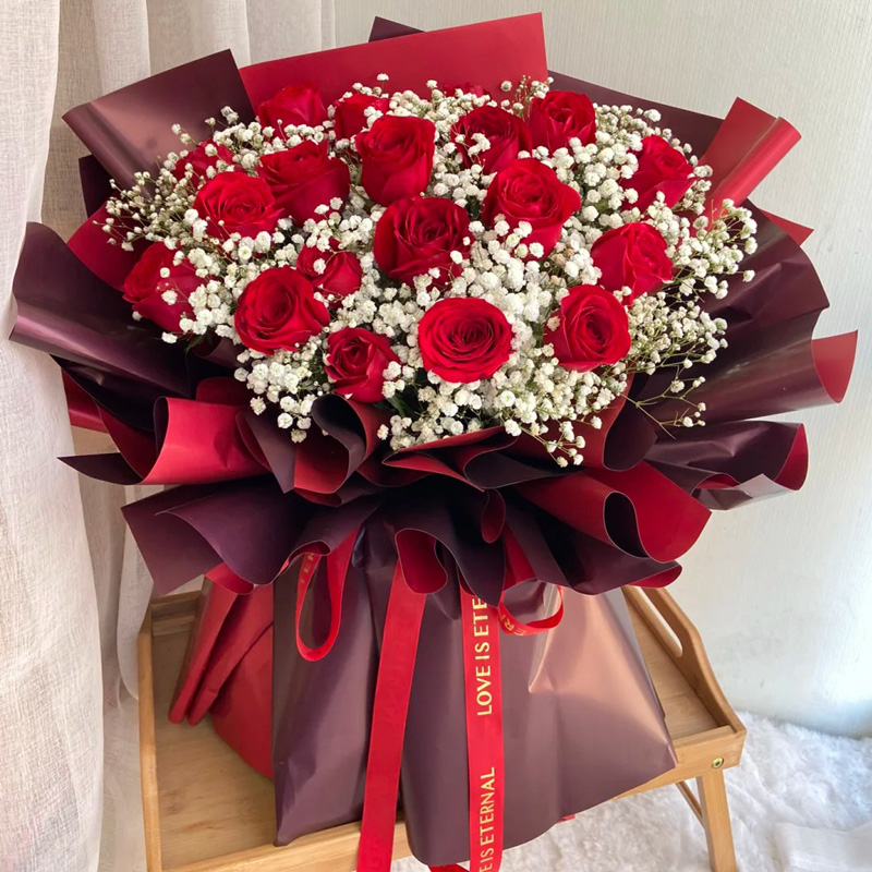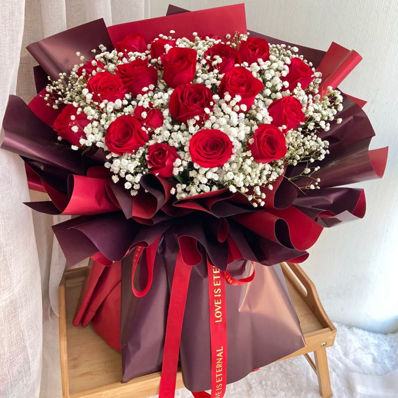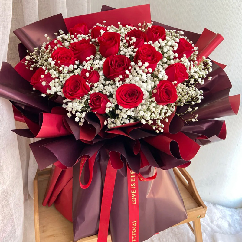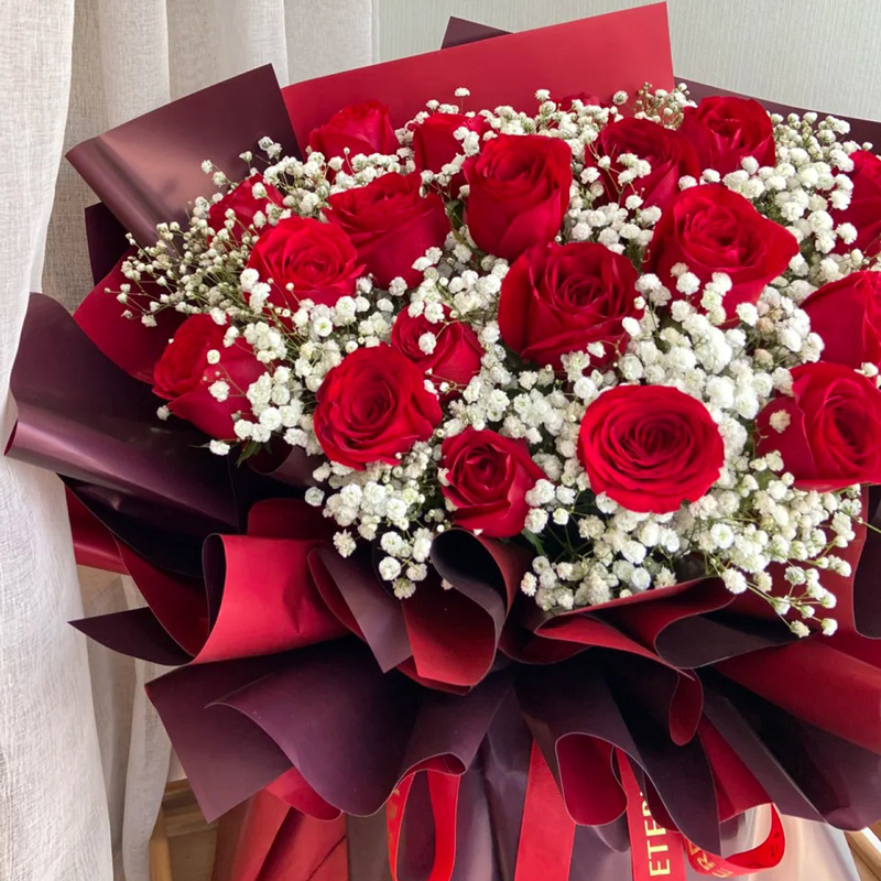 花材: 19朵红玫瑰,搭配满天星丰满间插。