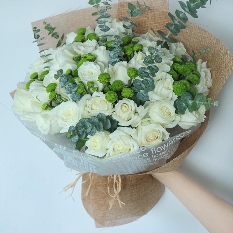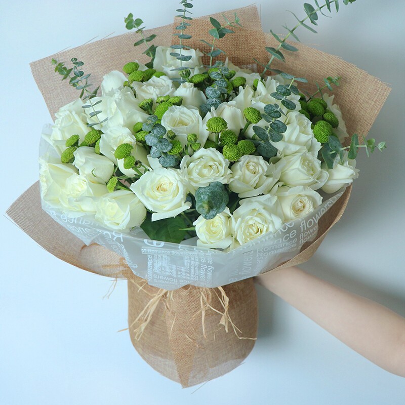 花 材:33朵精品白玫瑰,搭配绿色小雏菊、尤加利叶装饰。