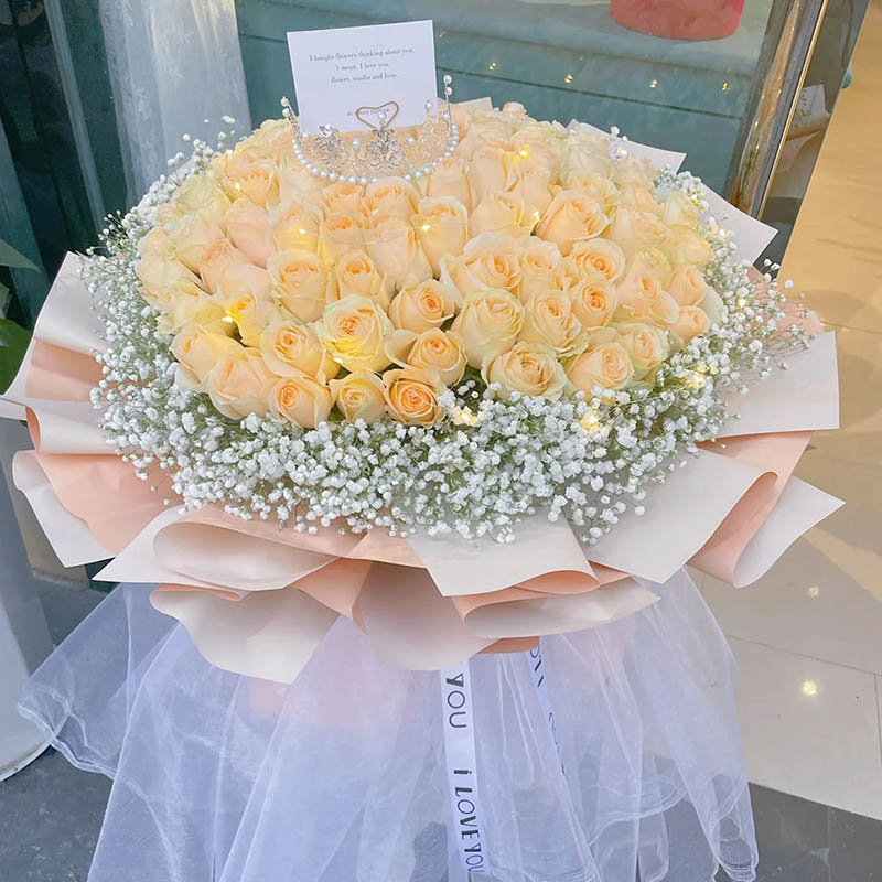 花 材:精选99朵香槟玫瑰花,1顶皇冠皇冠,满天星环绕装饰。