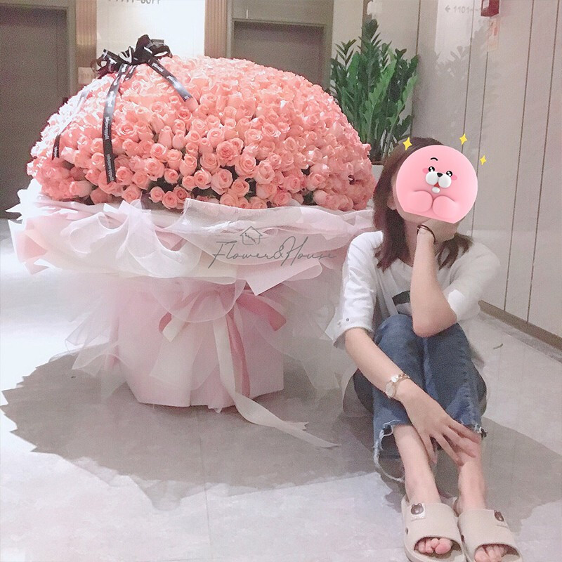 花 材:精选999朵优质粉玫瑰,花球造型,表面黑色缎带蝴蝶结。