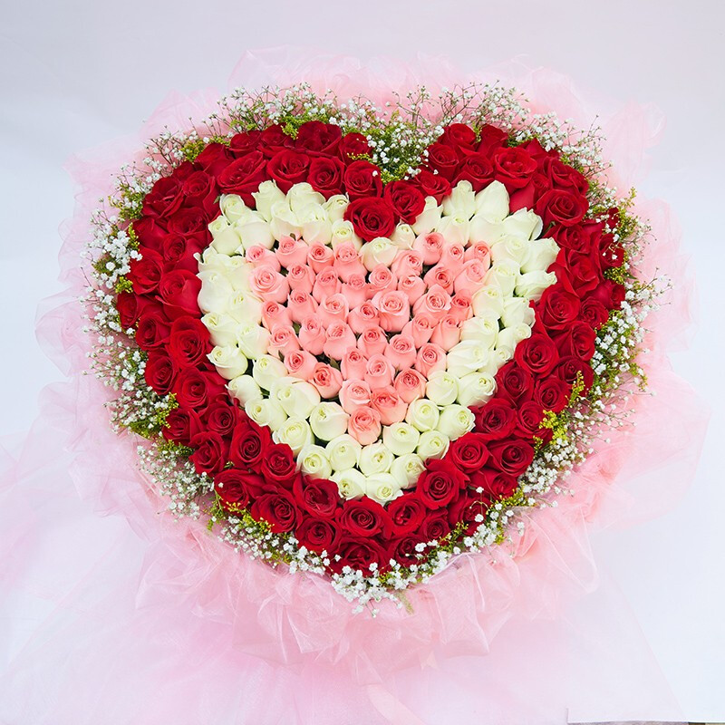 花材: 99朵混搭玫瑰(红玫瑰,白玫瑰(或香槟玫瑰),粉玫瑰,)三色心形造型,外围黄莺草、满天星装饰。