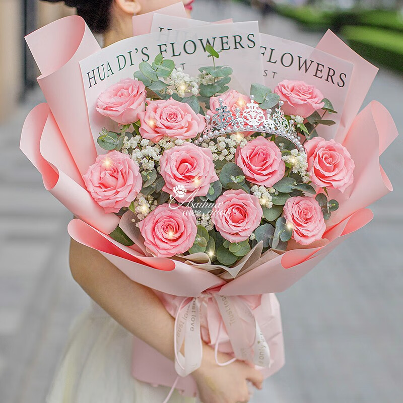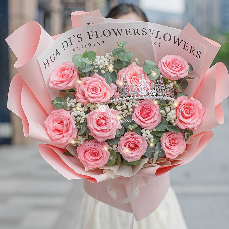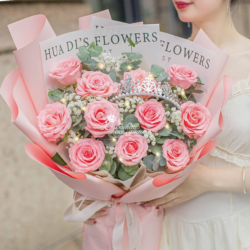 花 材:11朵粉玫瑰,1条灯带,1个皇冠(样式随机),搭配满天星尤加利叶装饰。