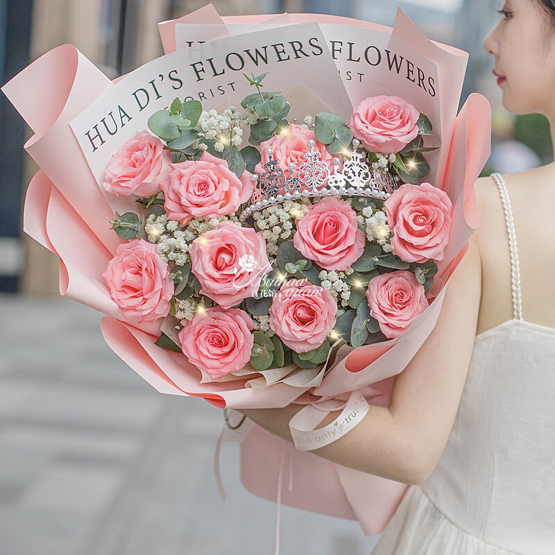 花材: 11朵粉玫瑰,1条灯带,1个皇冠(样式随机),搭配满天星尤加利叶装饰。
