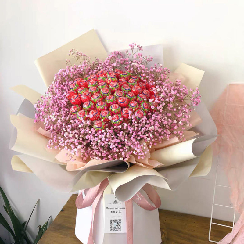 花 材:52颗棒棒糖,搭配粉色满天星装饰。