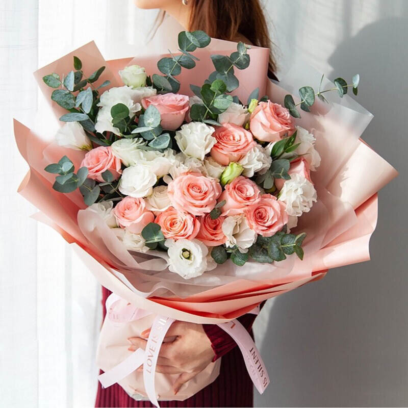 花 材:11朵精品粉玫瑰,16支白色桔梗(若桔梗断货则用22支白玫瑰替代),搭配尤加利叶装饰。