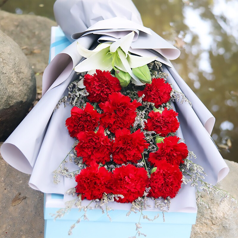 花材: 11朵红色康乃馨,1支白色多头香水百合,搭配情人草装饰。