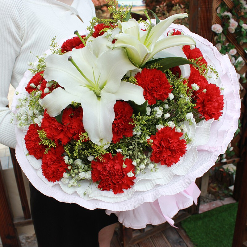 花材: 19朵红色康乃馨,1支白色多头香水百合,搭配满天星、黄莺草装饰。