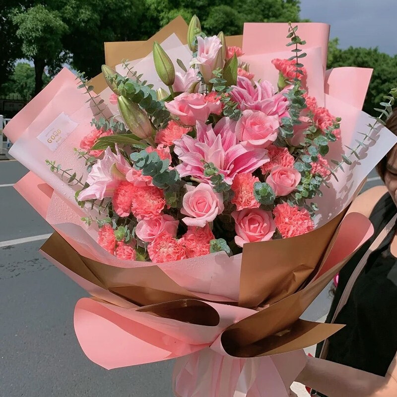 花 材:21朵粉色康乃馨,12朵粉玫瑰,3支粉色多头香水百合,搭配尤加利叶装饰。