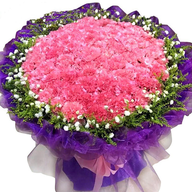 花材: 99朵粉色康乃馨,搭配满天星、黄莺草外围环绕。