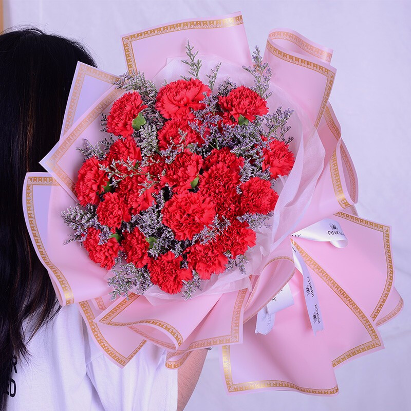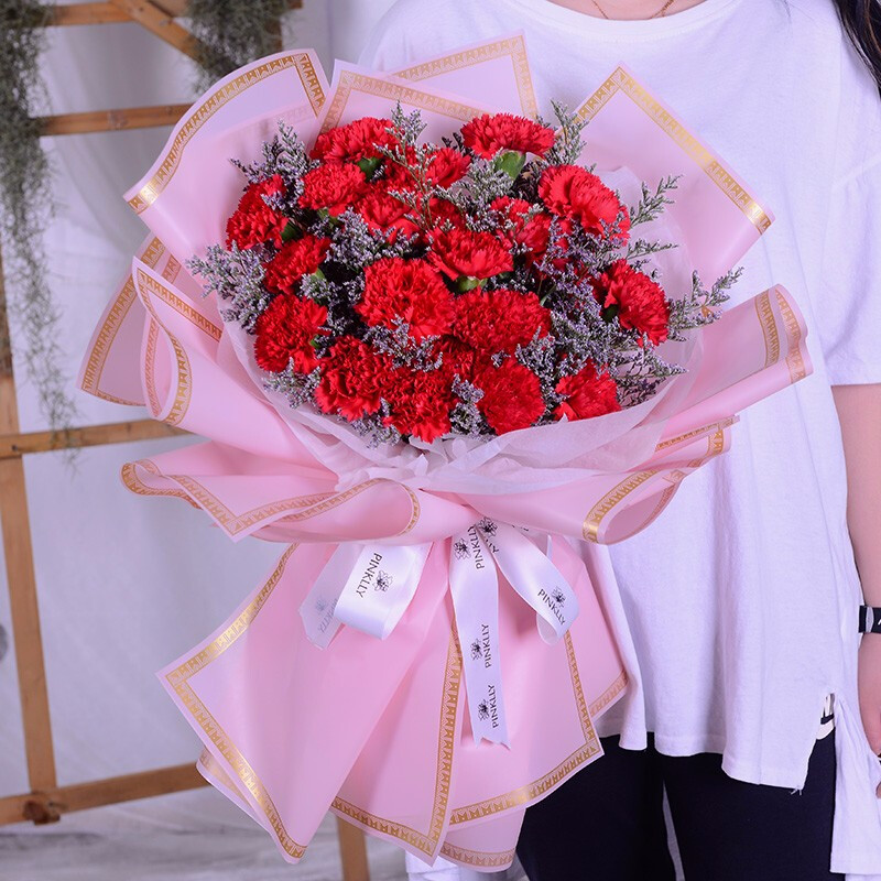 花 材:33朵红色康乃馨,搭配情人草装饰。