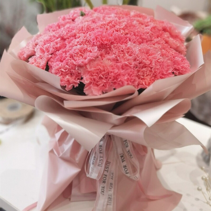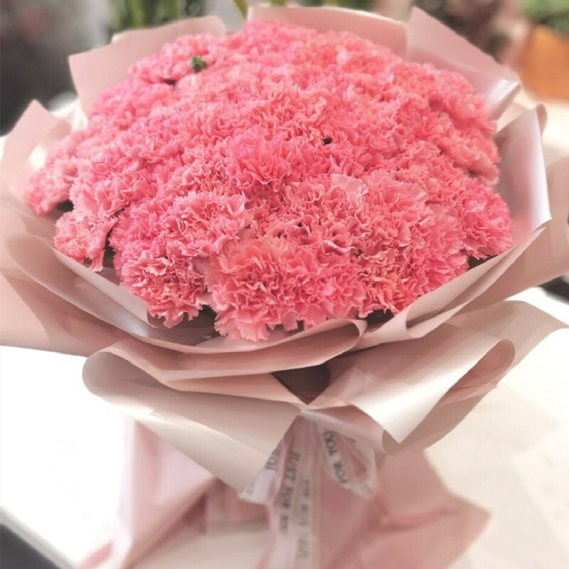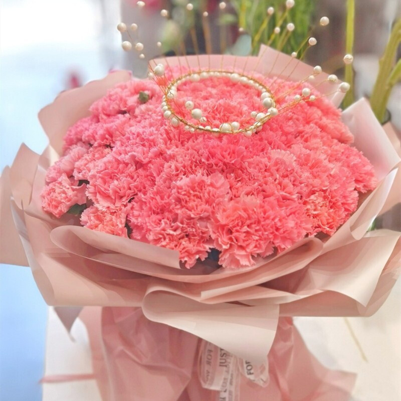 花材: 99朵粉色康乃馨,花面用皇冠装饰。
