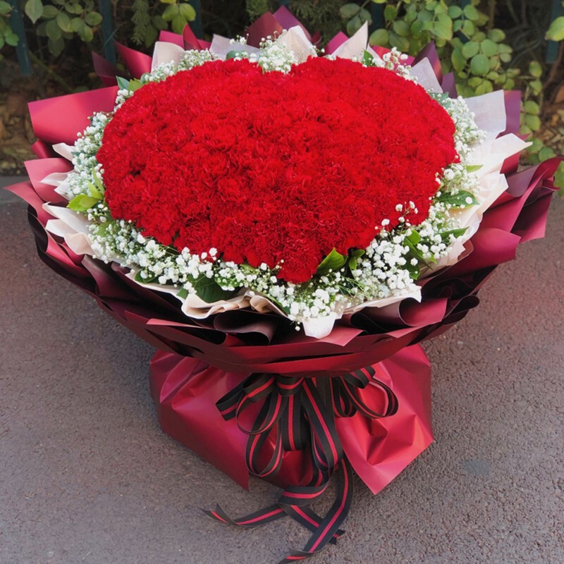 花 材:99朵红色康乃馨,白色满天星、栀子叶外围环绕。