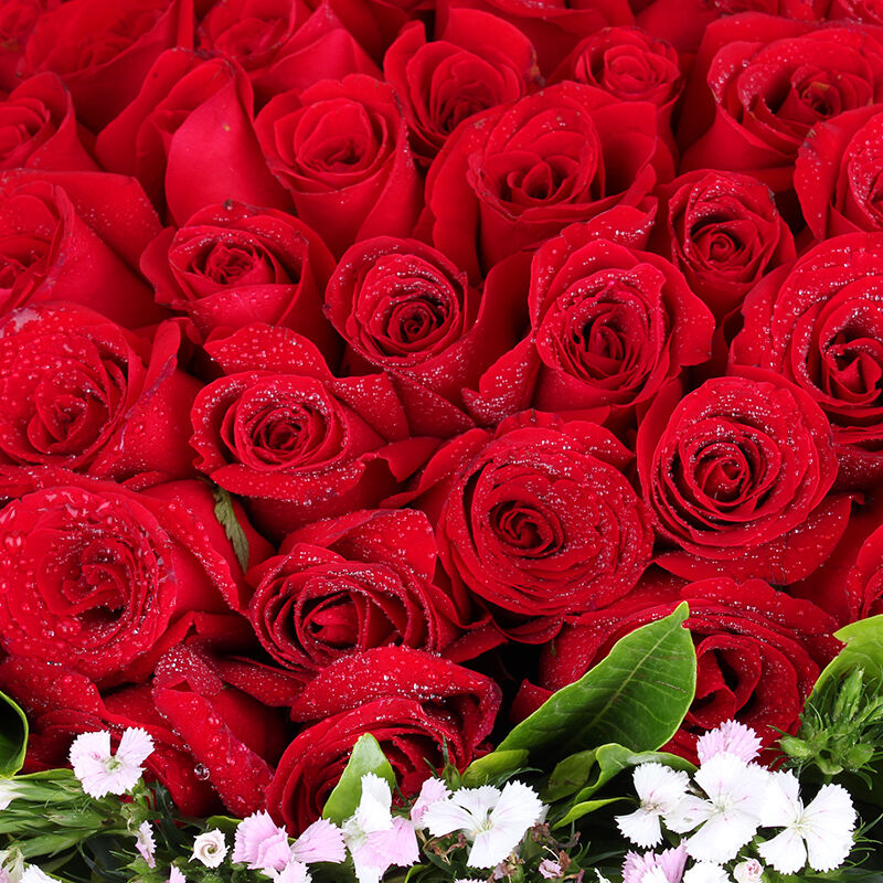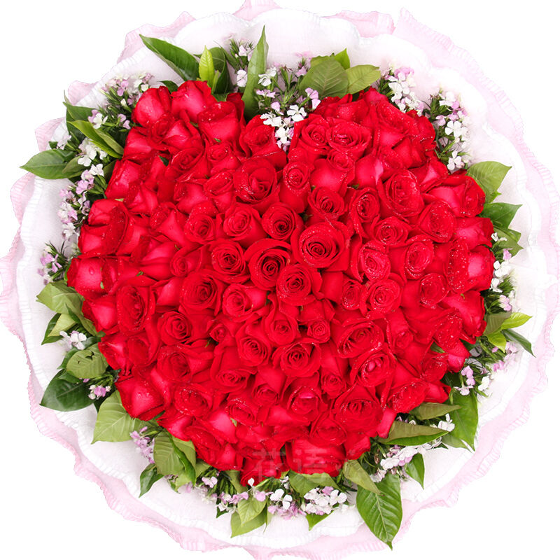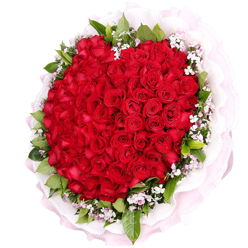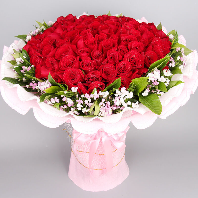 花材: 精选99朵顶级红玫瑰,栀子叶,相思梅围绕。