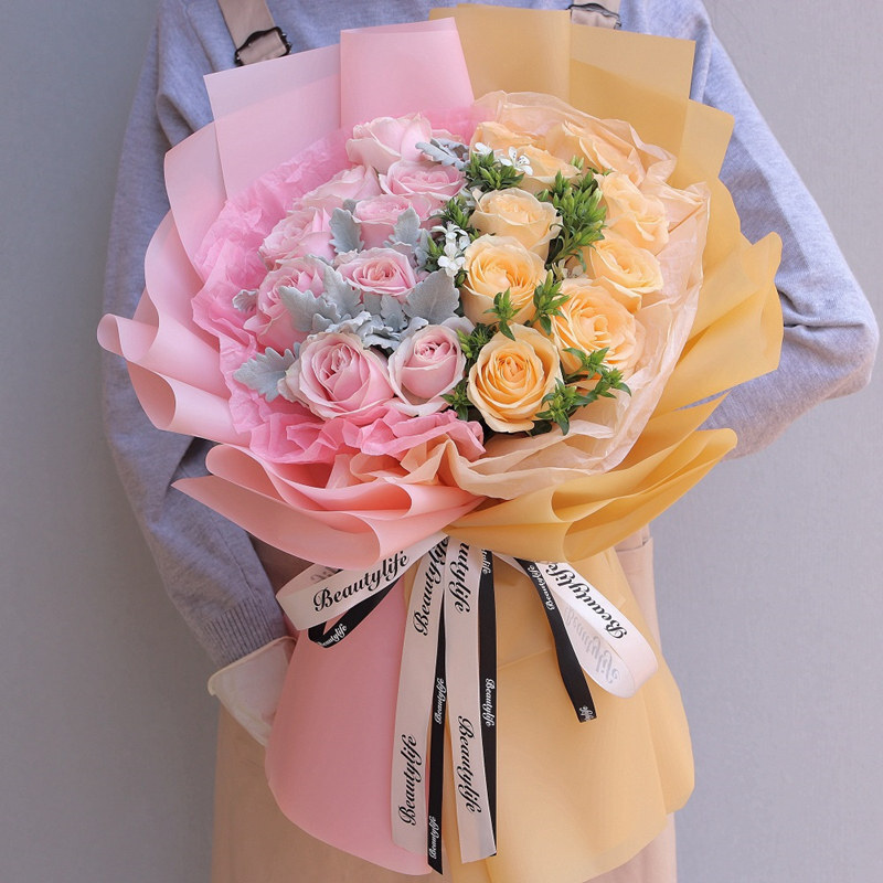 包装: 粉色玫瑰的半边外围用同色系粉色包装纸包装,香槟色玫瑰的半边外围用同色系香槟色包装纸包装,香槟色+黑色缎带花结。