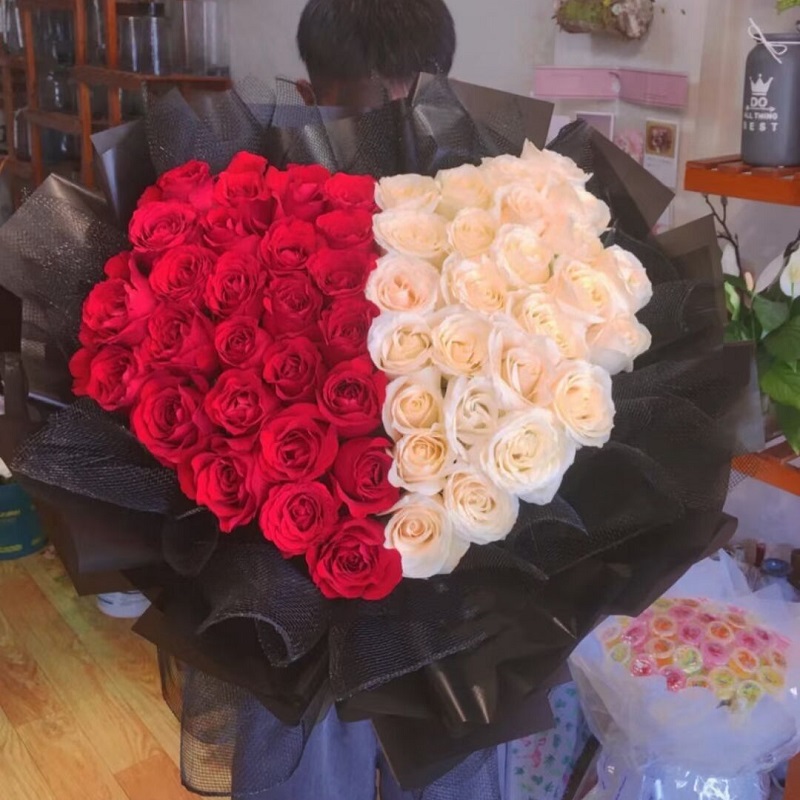 花材: 52朵精品玫瑰,左边26朵红玫瑰,右边26朵香槟玫瑰,心形形状造型。