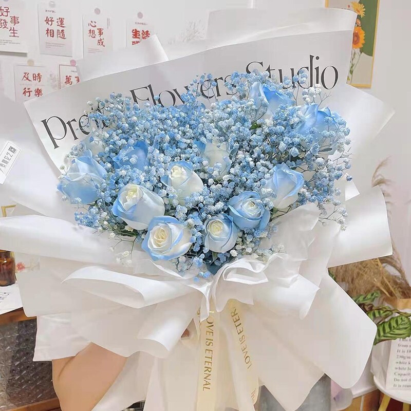 花 材:19枝碎冰蓝玫瑰,搭配蓝色满天星(珍贵稀少花材,请提前预订或咨询花艺师)