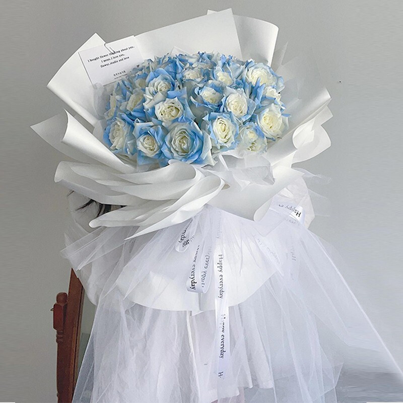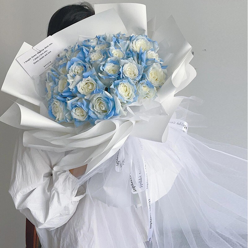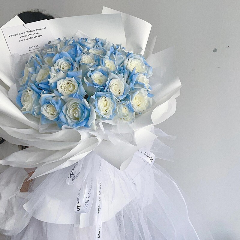 花 材:33枝碎冰蓝玫瑰(珍贵稀少花材,请提前预订或咨询花艺师)