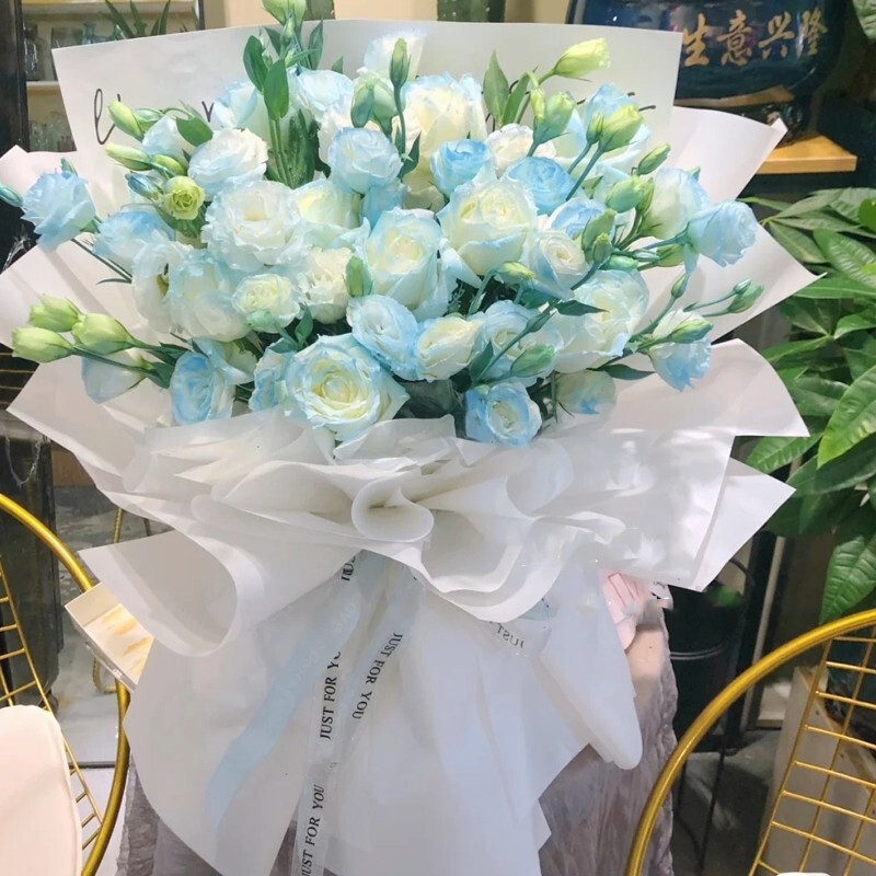 花 材:33朵精品碎冰蓝玫瑰,搭配16支白色洋桔梗(珍贵稀少花材,请提前预订或咨询花艺师)