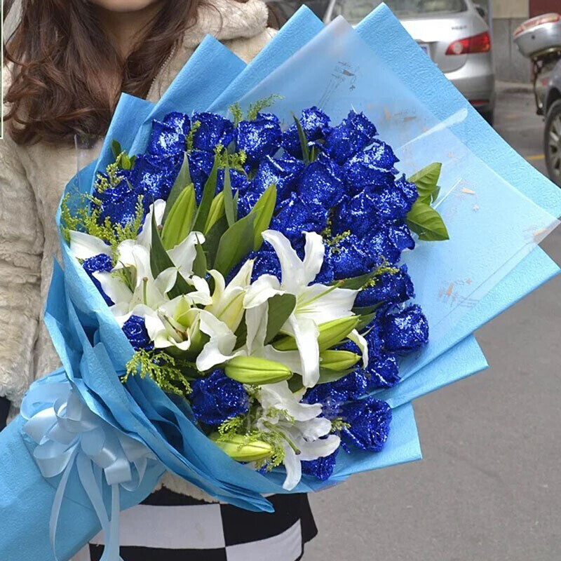 花材: 33朵蓝色妖姬,5支多头白色香水百合,搭配黄英草装饰。