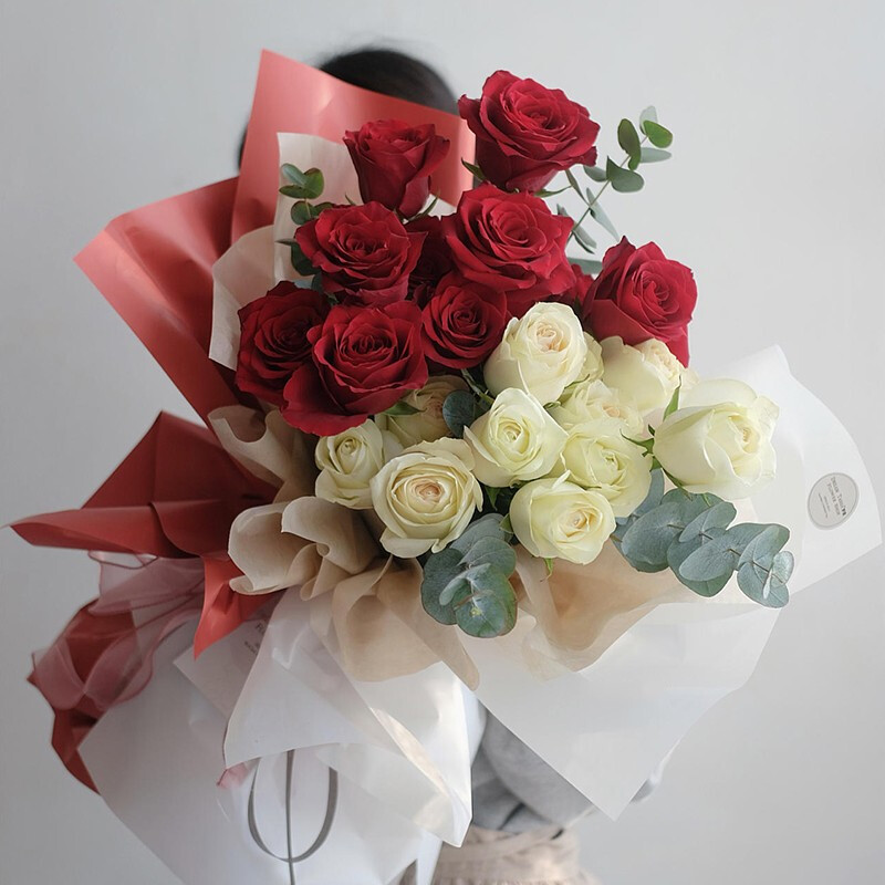 花 材:精选19朵玫瑰,左边10朵红玫瑰,右边9朵香槟色玫瑰,搭配尤加利叶装饰。