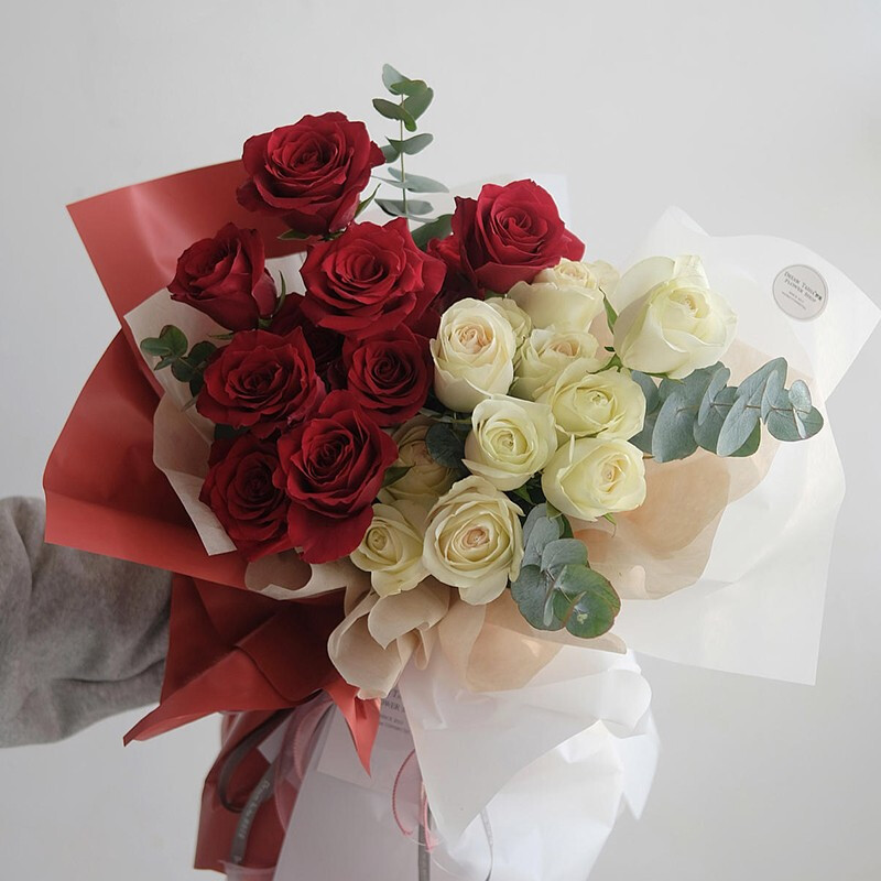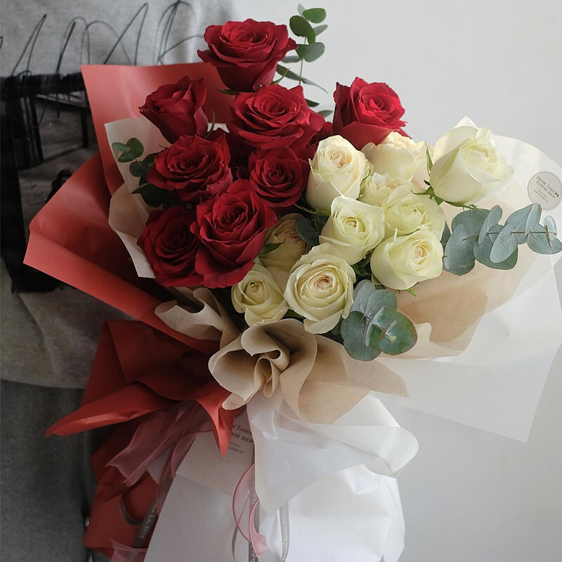 花材: 精选19朵玫瑰,左边10朵红玫瑰,右边9朵香槟色玫瑰,搭配尤加利叶装饰。