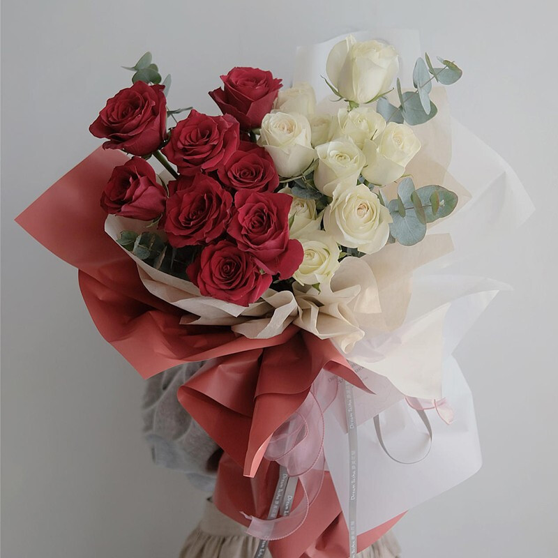 包装: 雪梨纸纸内衬,红玫瑰的半边外围用红色韩素纸包装,香槟色玫瑰的半边外围用白色韩素纸包装,红色+银灰色缎带花结。