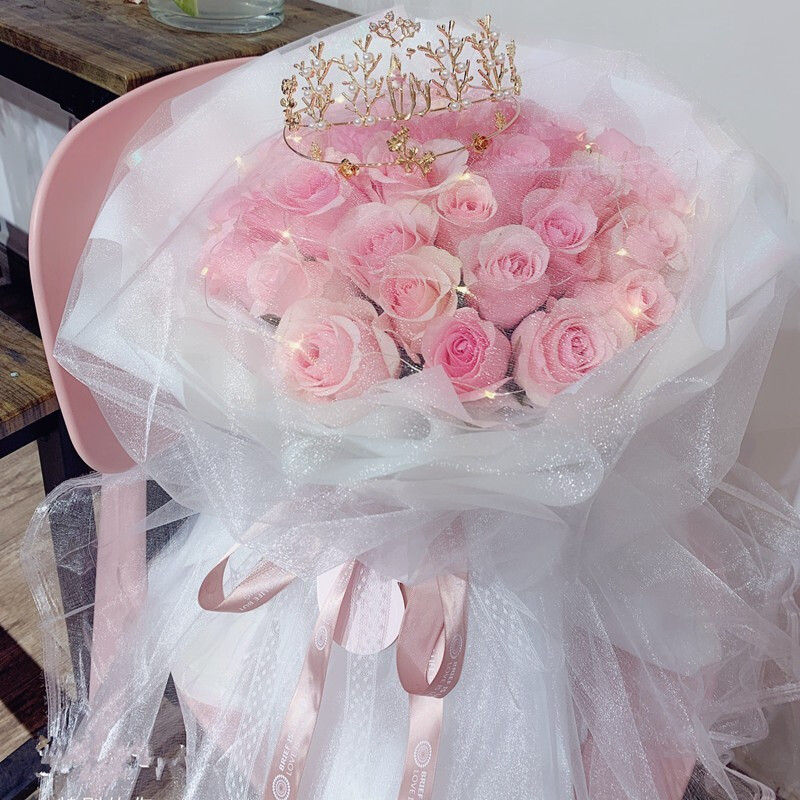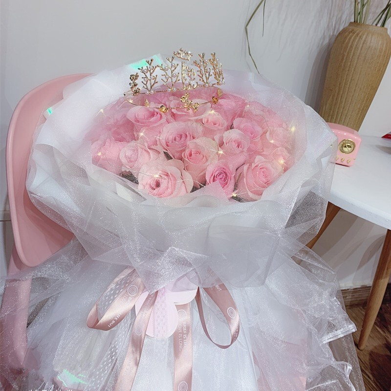 花材: 33朵精品粉玫瑰,皇冠装饰花面。