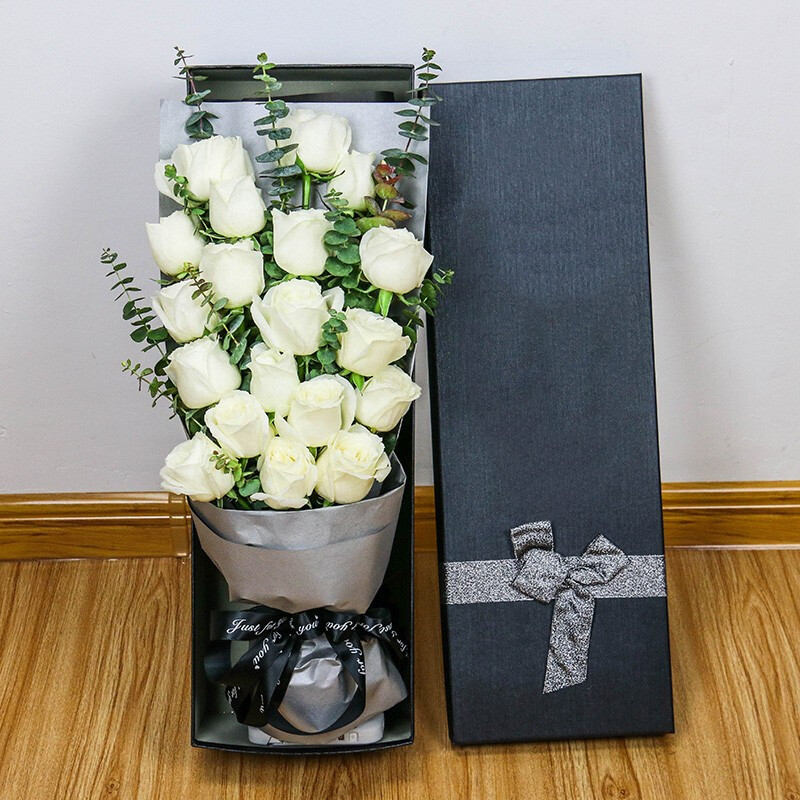 花材: 19朵白玫瑰,搭配尤加利叶装饰。