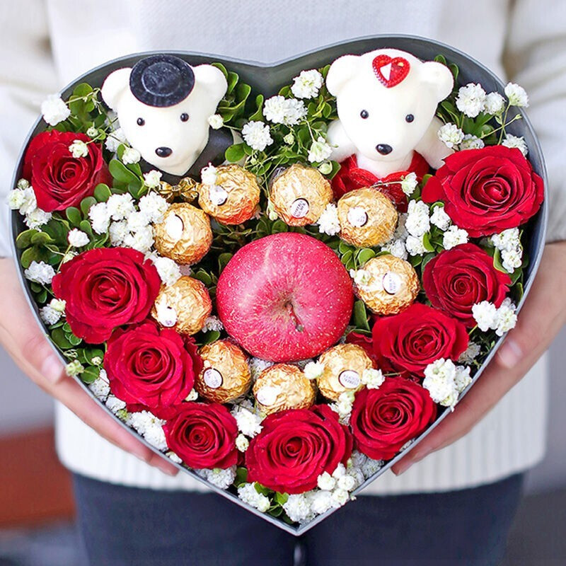 花 材:精选9朵红玫瑰,8粒费列罗巧克力,1颗红苹果,2只小熊,搭配满天星、栀子叶装饰。