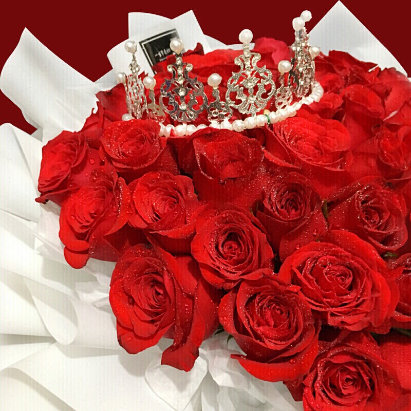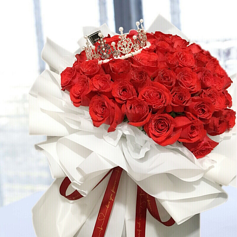 花材: 52朵红玫瑰,皇冠装饰花面。