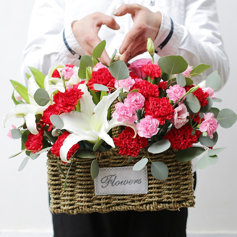 花 材:16朵红色康乃馨,10朵粉色康乃馨,2支白色香水百合,搭配洋桔梗、尤加利叶装饰。